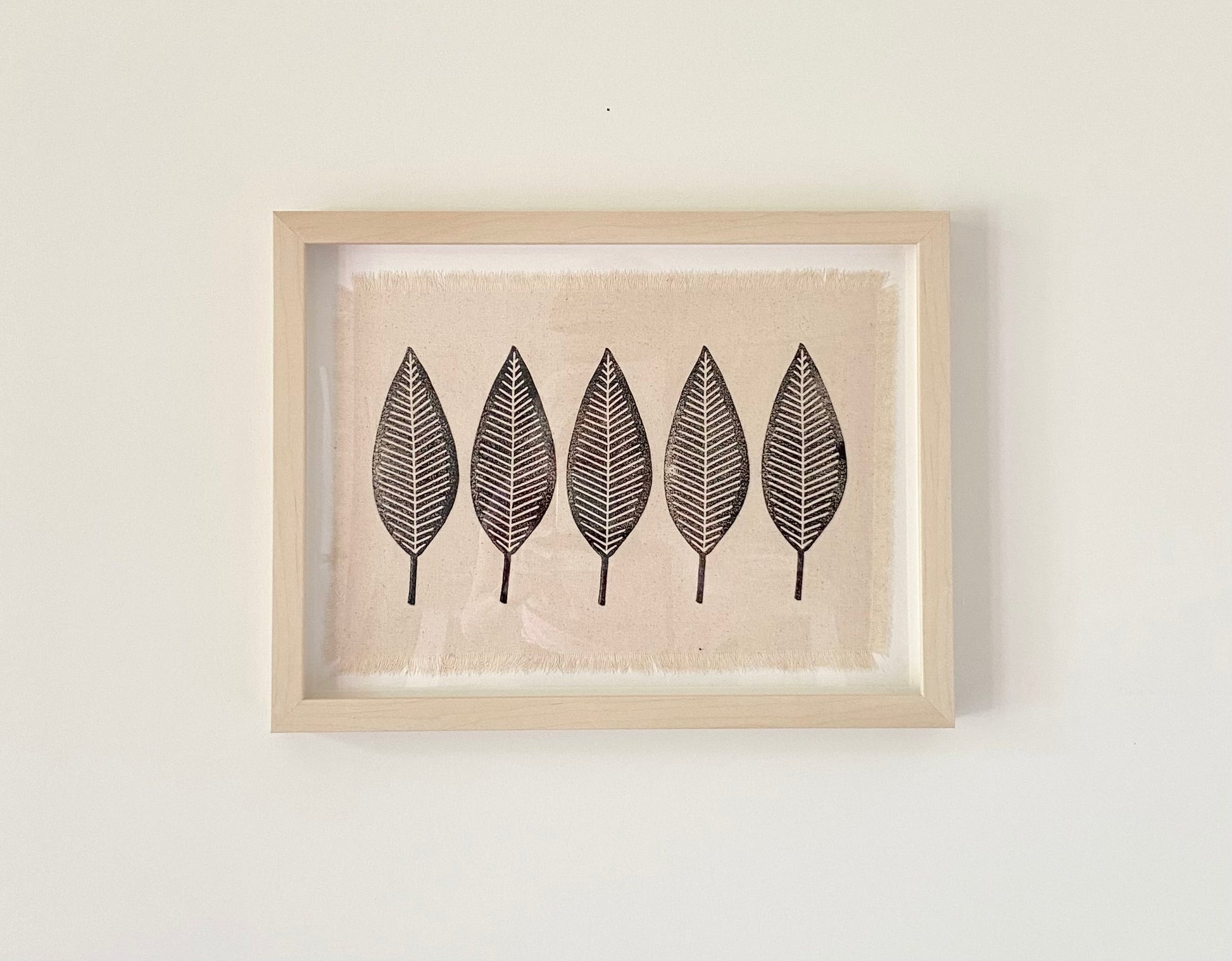 Hand block printed modern leaf print in black ink on natural, off white natural cotton canvas with frayed edge detail. Each textile wall art print begins as a sketch and is then hand carved and printed onto the fabric. Perfect art for adding to a gallery wall, on its own or layered on a shelf. Horizontal art piece.
