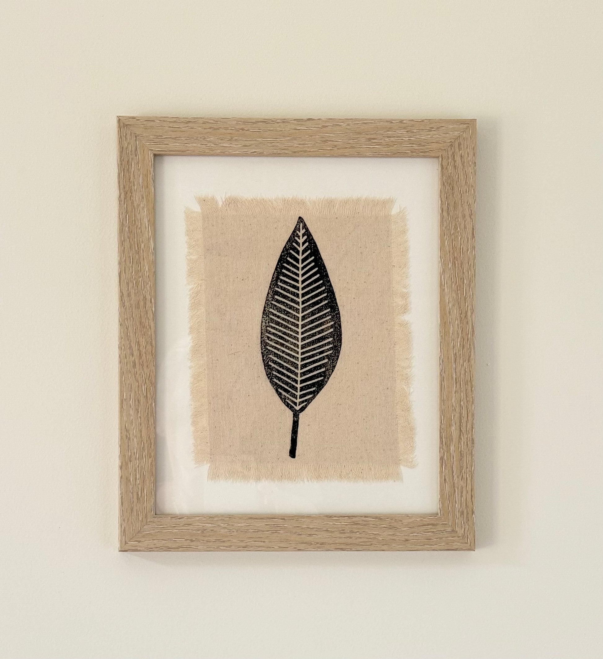 Hand block printed, single leaf print in black ink on natural, off white natural cotton canvas with frayed edge detail. Each textile art print begins as a sketch and is then hand carved and printed onto the fabric. Perfect art for adding to a gallery wall, on its own or layered on a shelf.