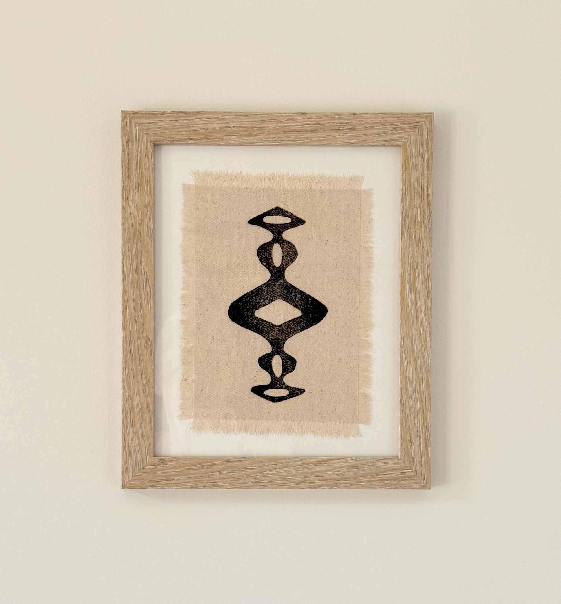 Hand block printed, minimalist, mod organic print in black ink on natural, off white natural cotton canvas with frayed edge detail. Each textile art print begins as a sketch and is then hand carved and printed onto the fabric. Perfect art for adding to a gallery wall, on its own or layered on a shelf.