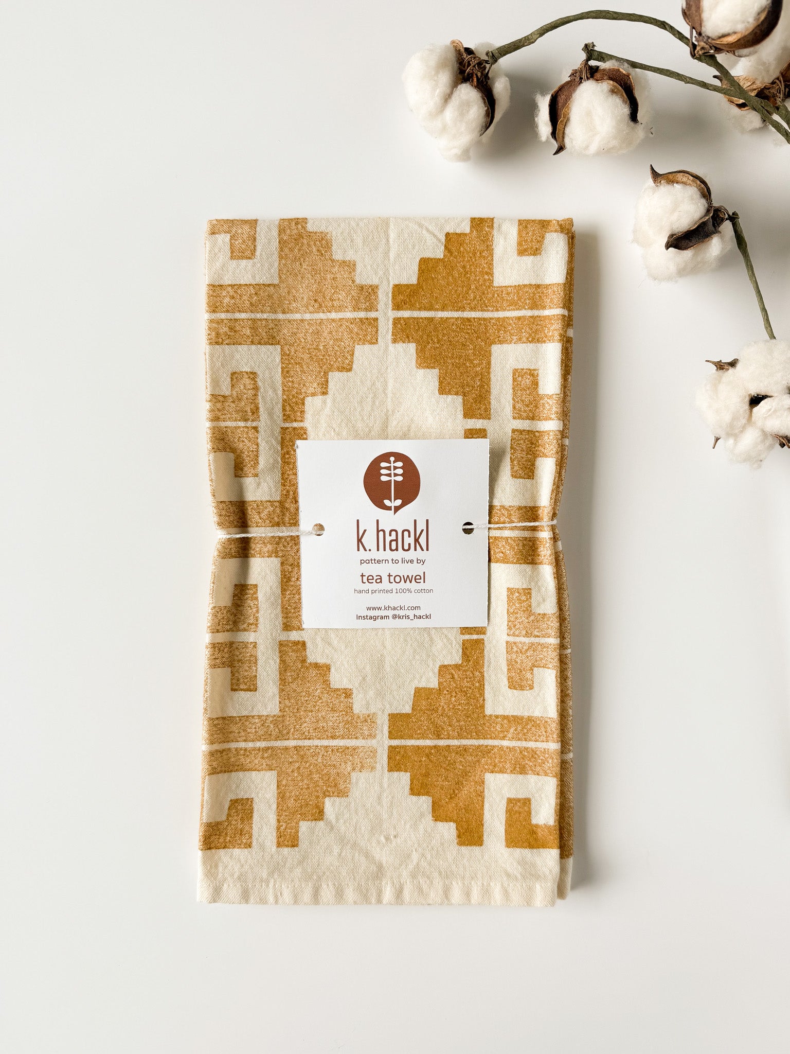 Each towel pattern begins as a sketch that is then hand carved and block printed into a unique pattern. Towels are made of a sturdy, absorbant cotton and soften as they age. Printed in my Wisconsin studio.